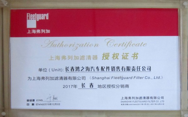 证书编号: 001 证书名称: 上海弗列加滤清器授权证书 发证机构: 上海弗列加滤清器有限公司 生效日期: 2016年12月05日 截止日期: 2026年12月05日 认证简介: 汽车产业开发区明鑫汽车配件经销处,个体工商户,经营汽车配件、轮胎、润滑油,批发零售。2017年长春地区授权分销商